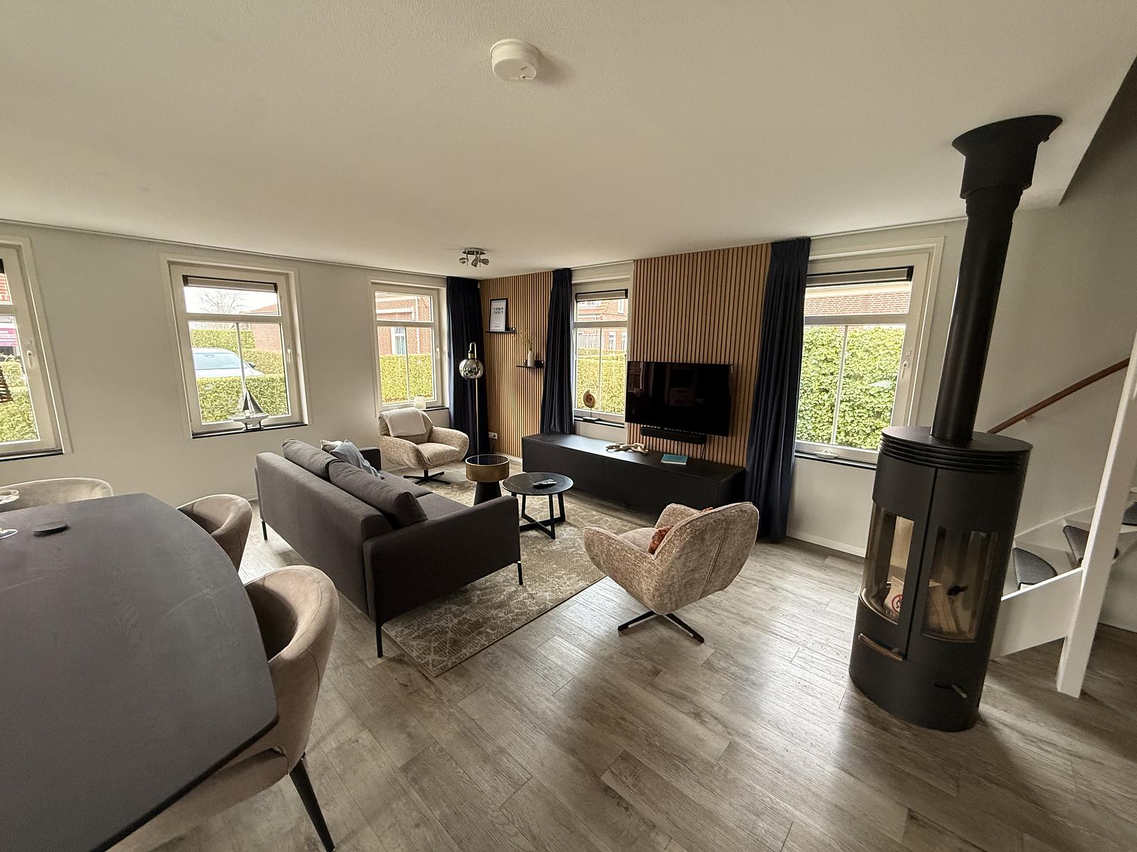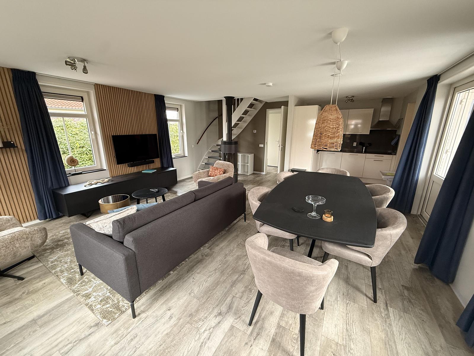 De woonkamer met moderne volledig uitgeruste keuken is het gezellige middelpunt van het huis. De 5 grote ramen en grote openslaande terrasdeuren geven een ruime en lichte uitstraling. Van uit de kamer is er de trap naar boven. Op de 1e verdieping bevinden zich 3 slaapkamers voor elk 2 personen en een mooie luxe badkamer met ligbad, douche, en wastafel.